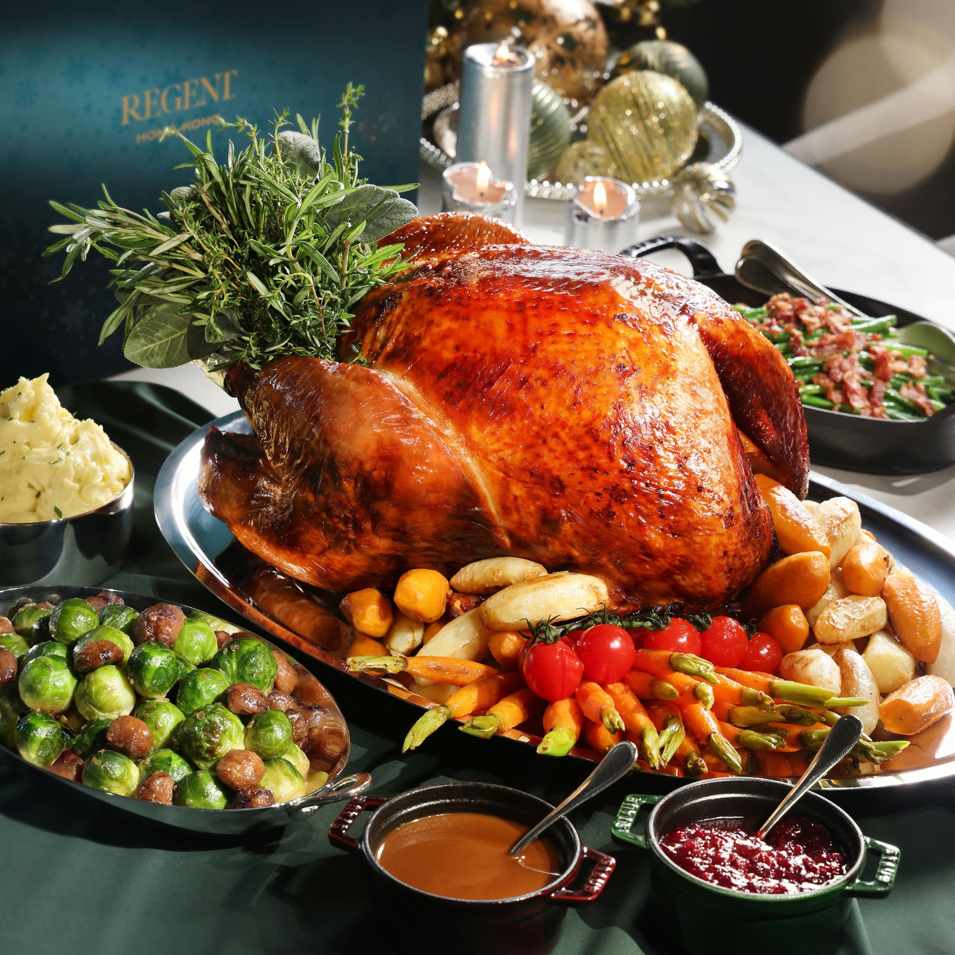 由香港麗晶酒店廚藝團隊精心烤製的嫩滑火雞,外皮金黃酥脆,肉質鮮嫩,搭配法邊豆、綿密薯蓉、抱子甘藍、蜜漬紅蘿蔔及烤時蔬,並附上傳統紅莓醬與香濃肉汁,成就一席節慶盛宴。 無需費心張羅,所有美味細節皆由我們悉心準備,讓您與親朋摯愛輕鬆共享節日歡聚時光,盡情感受溫馨與喜悅。